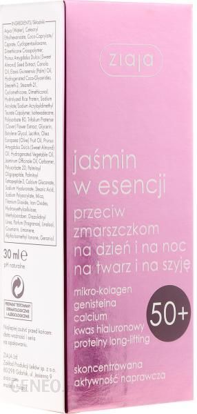na dzień/na nocna twarz/na szyjęmikro-kolagen genisteinacalcium kwas hialuronowyproteiny long-lifting skoncentrowana aktywność naprawczaEkskluzywna emulsja na dzień lub/i na noc do pielęgnacji skóry po 50 roku życia o skoncentrowanej aktywności przeciwzmarszczkowej. Autentycznie odpowiada na naturalne wymagania każdego rodzaju skóry dojrzałej. Kompensuje utratę kolagenu, fizjolipidów i kwasu hialuronowego. Zawiera fitoestrogen – genisteinę – izoflawon o aktywności hormono-podobnej, calcium – główny czynnik regenerujący epidermę oraz kompleks rozświetlający, który poprawia koloryt skóry.emulsja nawilżającabogata konsystencjaprzyjemny zapachnadaje się do domowego masażu twarzy i dekoltuAKTYWNOŚĆpoprawia gęstość skórymikro-kolagen genisteinaSkutecznie wzmacnia włókna kolagenu i elastyny.Organizuje prawidłowe usieciowanie włókien białkowych.Wyraźnie zwiększa gęstość i spoistość tkanki łącznej.Doskonale uelastycznia oraz zapobiega utracie sprężystości.zapobiega wiotczeniu, wygładza zmarszczkicalcium kwas hialuronowy proteiny long-liftingRegenerując funkcję podporową skóry zapobiega jej wiotczeniu.Redukuje głębokość zmarszczek głębokich i powierzchniowych.Trwale nawilża naskórek oraz głębsze warstwy skóry.Poprawia napięcie i zmniejsza szorstkość naskórka.liporegeneruje naskórekmasło jaśminowe NNKT z oleju oliwkowego, kokosowego, palmowego i CanolaReguluje funkcje bariery ochronnej skóry.Uzupełnia niedobory fizjologicznych lipidów.Wyraźnie odżywia i zmiękcza naskórek.poporawia koloryt skórykompleks rozświetlającyWyrównuje nierównomierny koloryt skóry.Zapewnia zdrowy, naturalny wygląd.UDOWODNIONA SKUTECZNOŚĆ*• redukcja zmarszczek – 27%,• poprawa wygładzenia skóry – 37%• redukcja szorstkości skóry – 39%wynik 28-dniowej kuracji potwierdzony badaniami in vivoSPOSÓB UŻYCIAEsencję nanieść 2-3 razy w tygodniu na dzień i/lub noc, na skórę twarzy i szyi, delikatnie wklepać. Przy skórze bardzo suchej najlepsze efekty pielęgnacyjne uzyskuje się po nałożeniu esencji na skórę twarzy i szyi bezpośrednio po wchłonięciu kremu na dzień i/lub na noc. Nadaje się do masażu skóry twarzy i dekoltu.Opakowanie30 ml