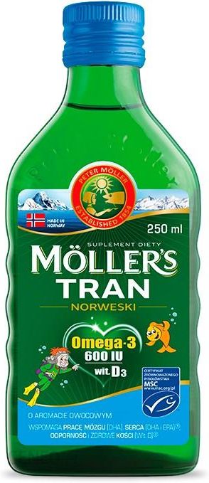 Möller’s Tran Norweski o aromacie owocowymto najwyższej jakości, oryginalny tran z Norwegii. Stanowi uzupełnienie codziennej diety w nienasycone kwasy tłuszczowe omega-3 oraz witaminy D3, A i E.