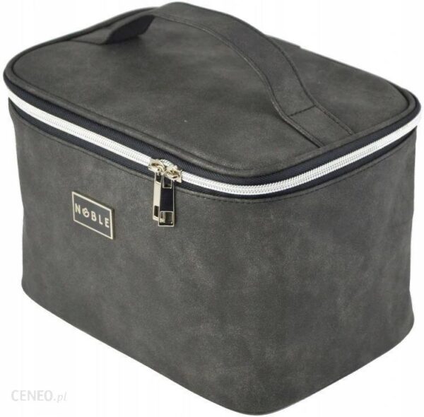 Kosmetyczka Avanti 003 marki NOBLE. Posiada formę dość dużego kuferka podrożonego, do którego zmieszczą się wszelkie niezbędne kosmetyki i akcesoria na daleką wyprawę. Wykonana została z miękkiej w dotyku, specjalnej zamszowej skóry ekologicznej o bardzo minimalistycznym i jednocześnie eleganckim wzorze. Całości dopełnia subtelny biały zamek wraz z płytką z logiem producenta na przodzie kosmetyczki. W środku kuferek posiada dużą komorę bez żadnych kieszonek i przegród, wyściełaną syntetycznym, czarnym i łatwym do czyszczenia materiałem. Na górze wieczka znajduje się poręczna rączka, która ułatwia transport. Kosmetyczka. Posiada kształt kuferka. Do przechowywania i organizacji kosmetyków.Została wyposażona w rączkę ułatwiającą transport.